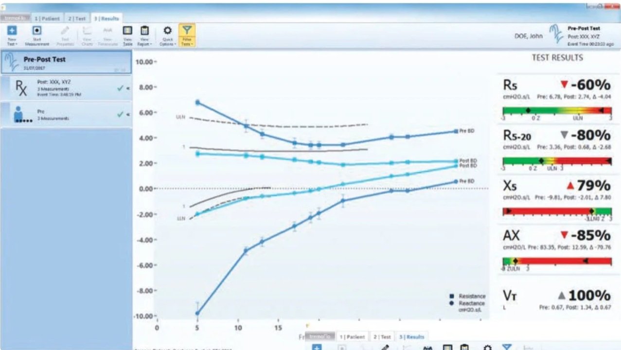 To assess respiratory function, the tremoflo adds a gentle oscillatory wave to the patient’s regular, quiet breathing. A short measurement duration of only 20 seconds allows three repetitions within a couple of minutes, even in patients who have difficulty performing spirometry.
